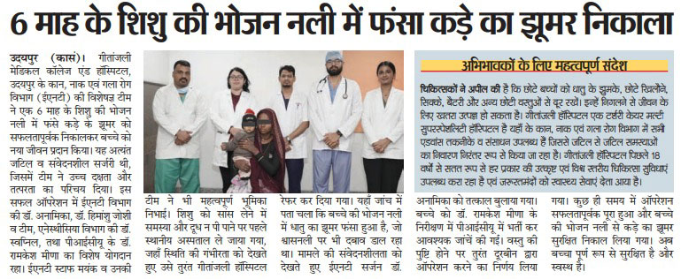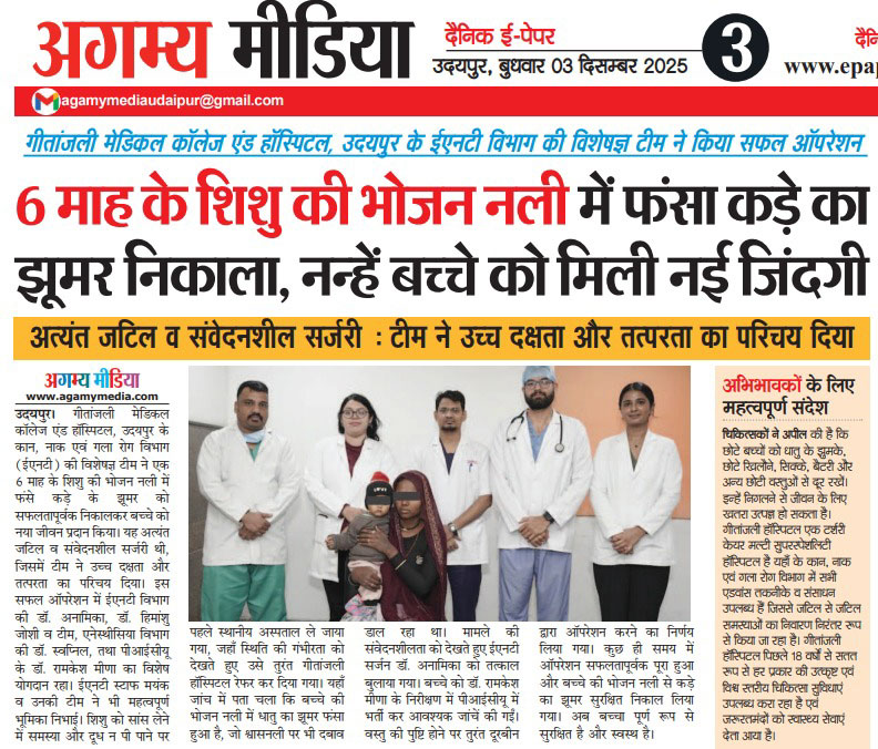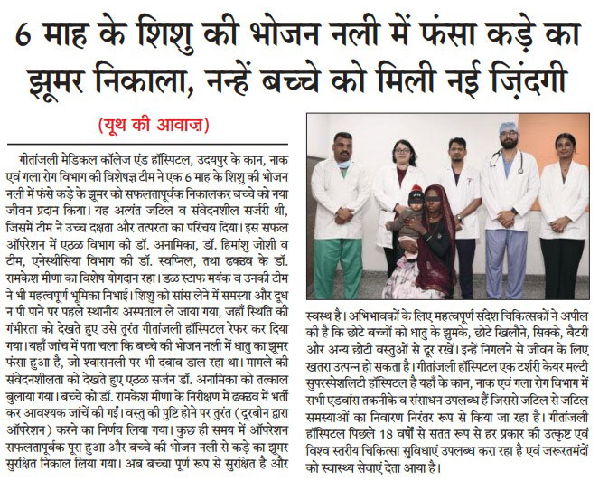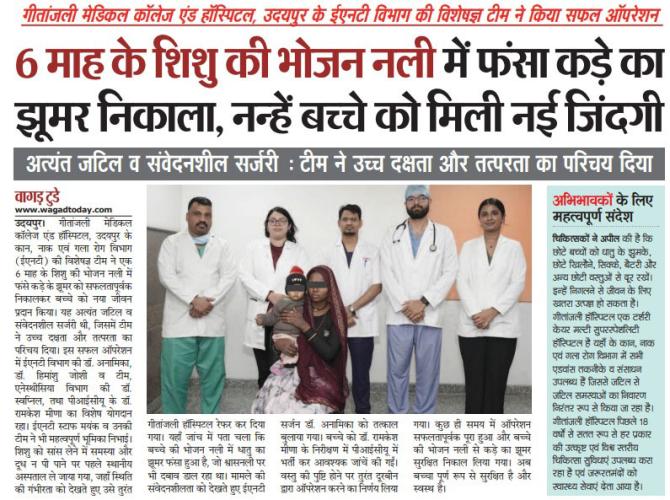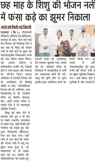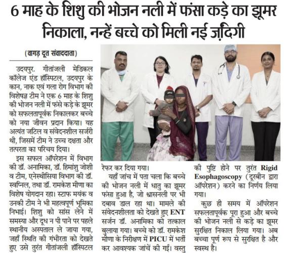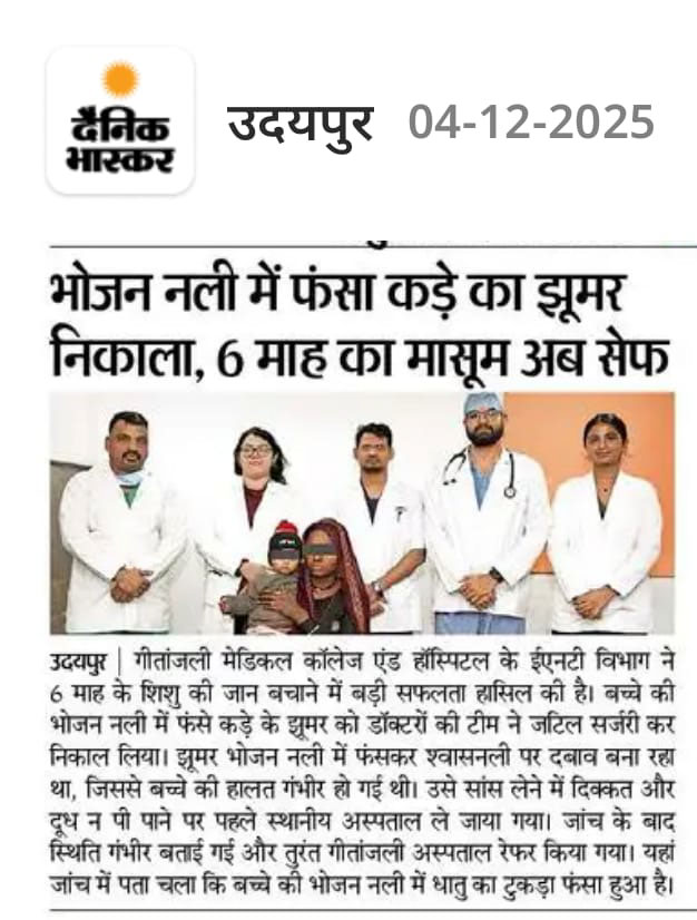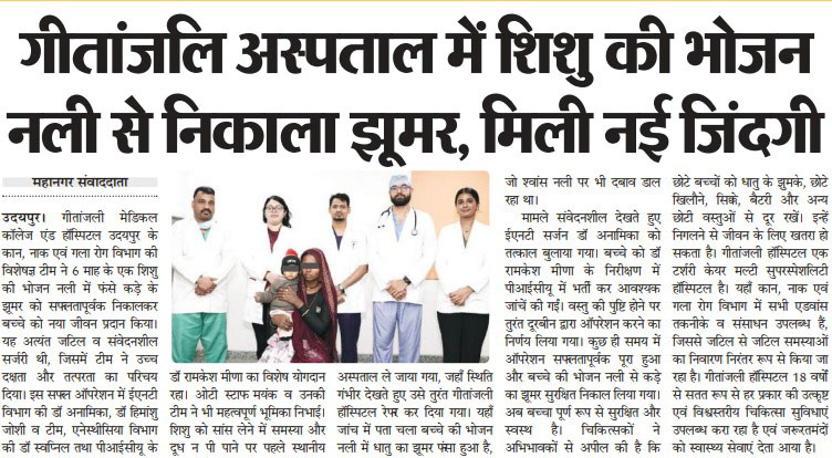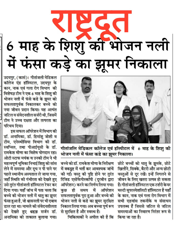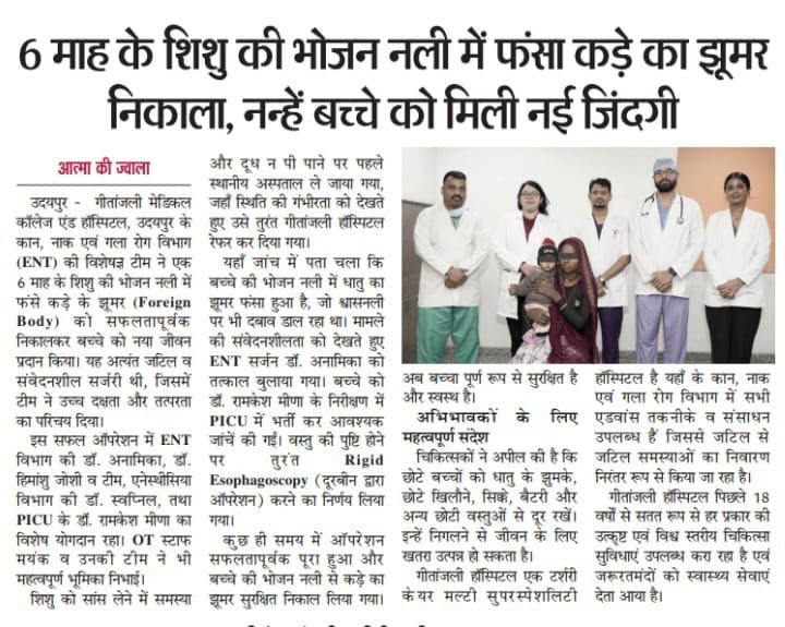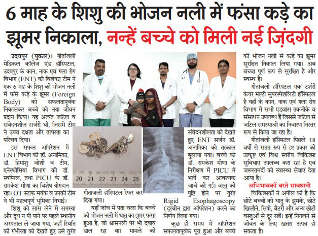 गीतांजली मेडिकल कॉलेज एंड हॉस्पिटल, उदयपुर के कान, नाक एवं गला रोग विभाग (ENT) की विशेषज्ञ टीम ने एक 6 माह के शिशु की भोजन नली में फंसे कड़े के झूमर (Foreign Body) को सफलतापूर्वक निकालकर बच्चे को नया जीवन प्रदान किया। यह अत्यंत जटिल व संवेदनशील सर्जरी थी, जिसमें टीम ने उच्च दक्षता और तत्परता का परिचय दिया।