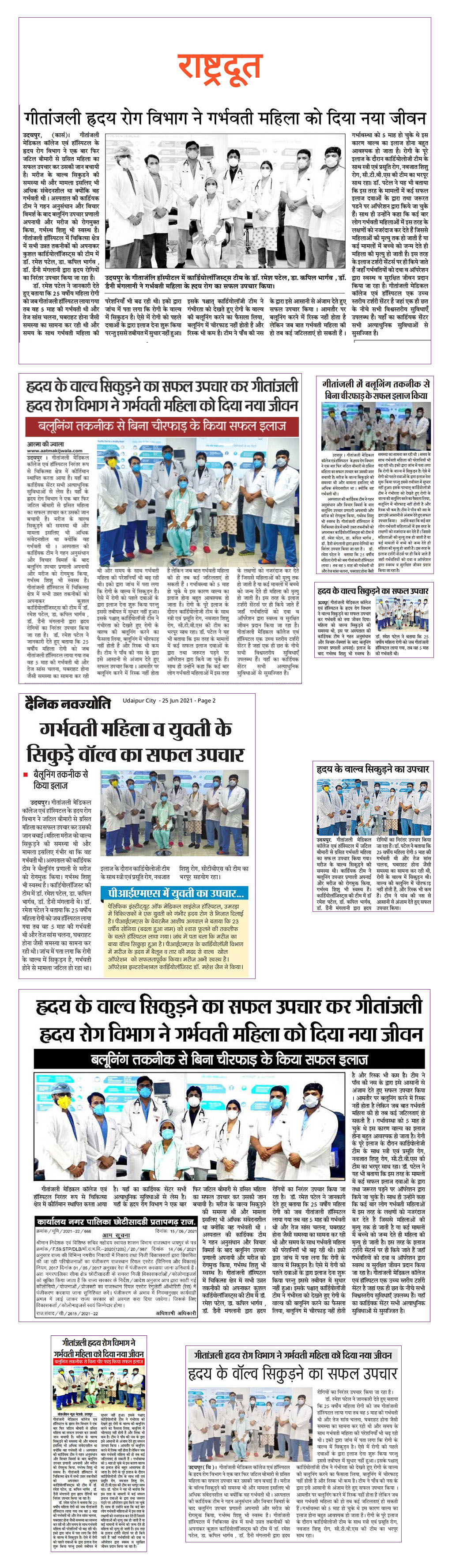 गीतांजली मेडिकल कॉलेज एवं हॉस्पिटल निरंतर रूप से चिकित्सा क्षेत्र में कीर्तिमान स्थापित करता आया है| यहाँ का कार्डियक सेंटर सभी अत्याधुनिक सुविधाओं से लेस है| यहाँ के ह्रदय रोग विभाग ने एक बार फिर जटिल बीमारी से ग्रसित महिला का सफल उपचार कर उसकी जान बचायी है। मरीज के वाल्व सिकुड़ने की समस्या थी और मामला इसलिए भी अधिक संवेदनशील था क्योंकि वह गर्भवती थी । अस्पताल की कार्डियक टीम ने गहन अनुसंधान और विचार विमर्श के बाद बलूनिंग उपचार प्रणाली अपनायी और मरीज को रोगमुक्त किया, गर्भस्थ शिशु भी स्वस्थ है। गीतांजली हॉस्पिटल में चिकित्सा क्षेत्र में सभी उन्नत तकनीकों को अपनाकर कुशल कार्डियोलॉजिस्ट्स की टीम में डॉ. रमेश पटेल, डा. कपिल भार्गव , डॉ. डैनी मंगलानी द्वारा ह्रदय रोगियों का निरंतर उपचार किया जा रहा है।