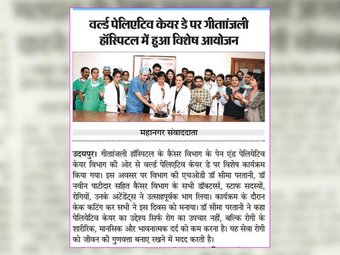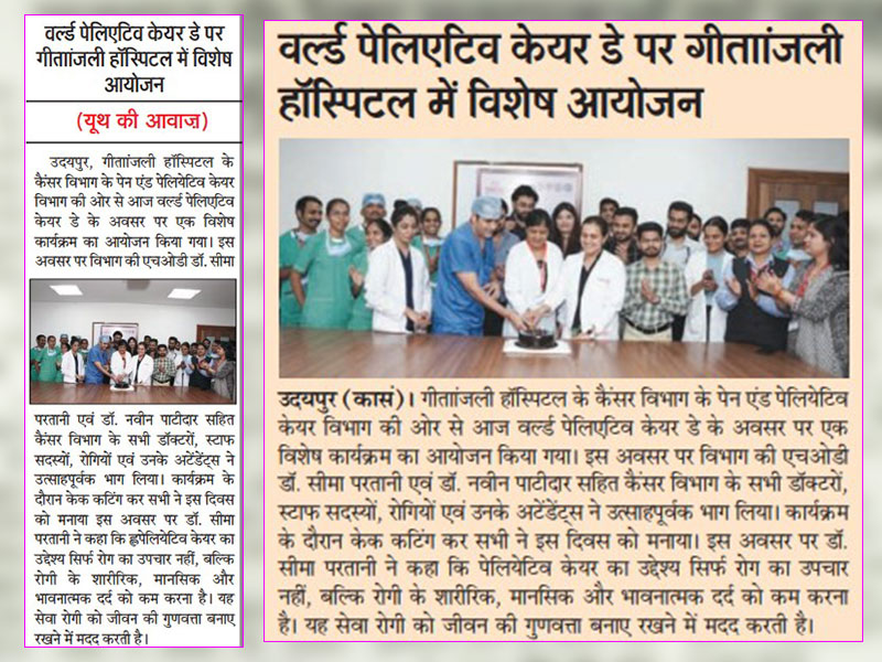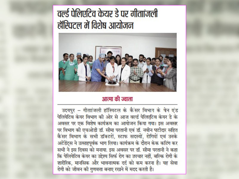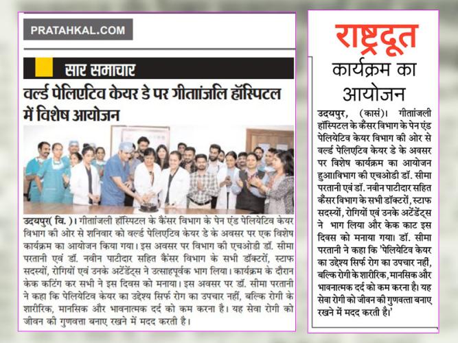 उदयपुर, 11 अक्टूबर — गीताांजली हॉस्पिटल के कैंसर विभाग के पेन एंड पेलियेटिव केयर विभाग की ओर से आज वर्ल्ड पेलिएटिव केयर डे के अवसर पर एक विशेष कार्यक्रम का आयोजन किया गया।