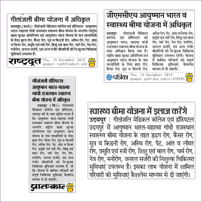 गीतांजली मेडिकल कॉलेज एवं हॉस्पिटल, उदयपुर हर्ष के साथ सूचित करता है कि आयुष्मान भारत-महात्मा गांधी राजस्थान स्वास्थ्य बीमा योजना के अन्तर्गत राष्ट्रीय खाद्य सुरक्षा अधिनियम एवं आयुष्मान भारत योजना के पात्र लाभार्थियो के लिए ह्रदय रोग, कैंसर रोग, मूत्र व किडनी रोग, अस्थि रोग, पेट, आंत व लिवर रोग, प्रसूति एवं स्त्री रोग, शिशु एवं बाल रोग, चर्म रोग, नेत्र रोग, मनोरोग, जनरल सर्जरी, एवं अन्य गंभीर बीमारियों की निःशुल्क चिकित्सा सुविधाएं उपलब्ध है, जो कि योजना में शामिल परिवारों को संपूर्ण चिकित्सा सुविधाएं कैशलेस माध्यम से दी जाएंगी| उल्लेखनीय है कि गीतांजली हॉस्पिटल, उदयपुर पिछले 13 वर्षों से सतत रूप से हर प्रकार की उत्कृष्ट एवं विश्वस्तरीय चिकित्सा सुविधाएं उपलब्ध करा रहा है एवं जरूरतमंदों को स्वास्थ्य सेवाएं देता आया है|