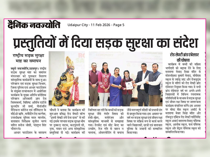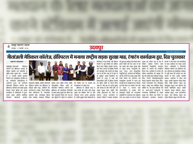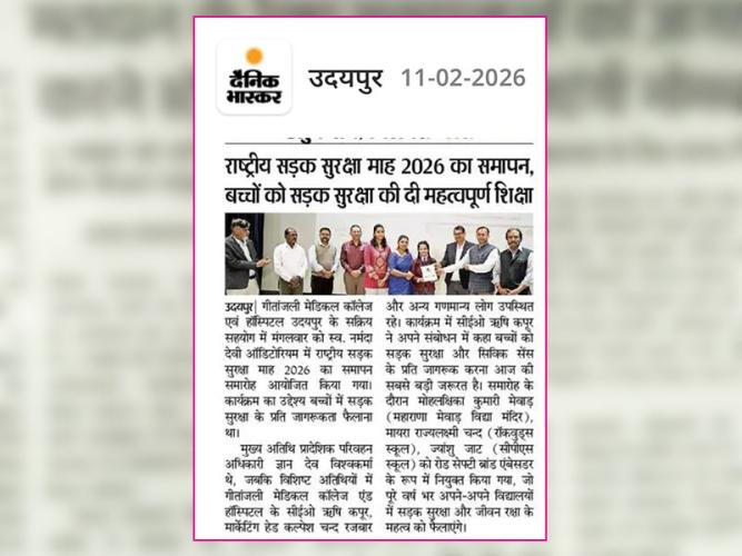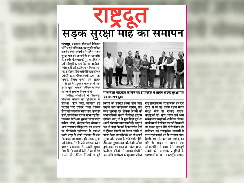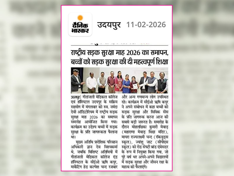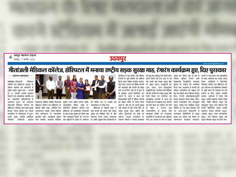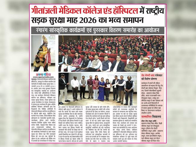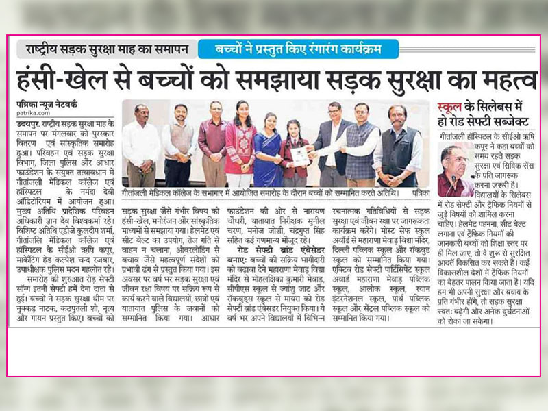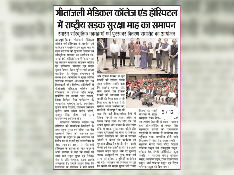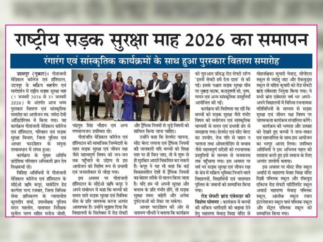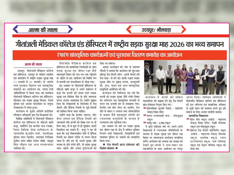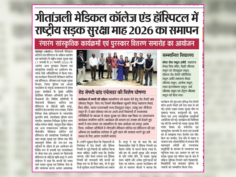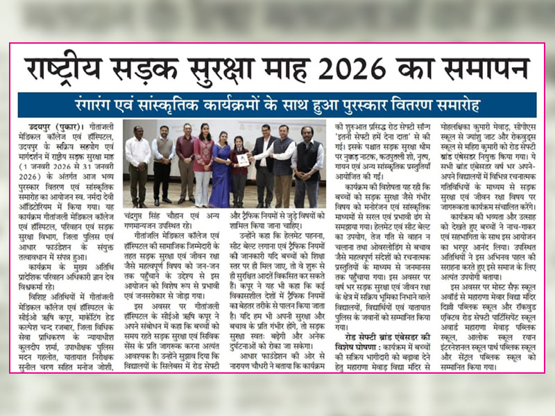 गीतांजली मेडिकल कॉलेज एवं हॉस्पिटल, उदयपुर के सक्रिय सहयोग एवं मार्गदर्शन में राष्ट्रीय सड़क सुरक्षा माह (1 जनवरी 2026 से 31 जनवरी 2026) के अंतर्गत आज भव्य पुरस्कार वितरण एवं सांस्कृतिक समारोह का आयोजन स्व. नर्मदा देवी ऑडिटोरियम में किया गया। यह कार्यक्रम गीतांजली मेडिकल कॉलेज एवं हॉस्पिटल, परिवहन एवं सड़क सुरक्षा विभाग, जिला पुलिस एवं आधार फाउंडेशन के संयुक्त तत्वावधान में संपन्न हुआ।