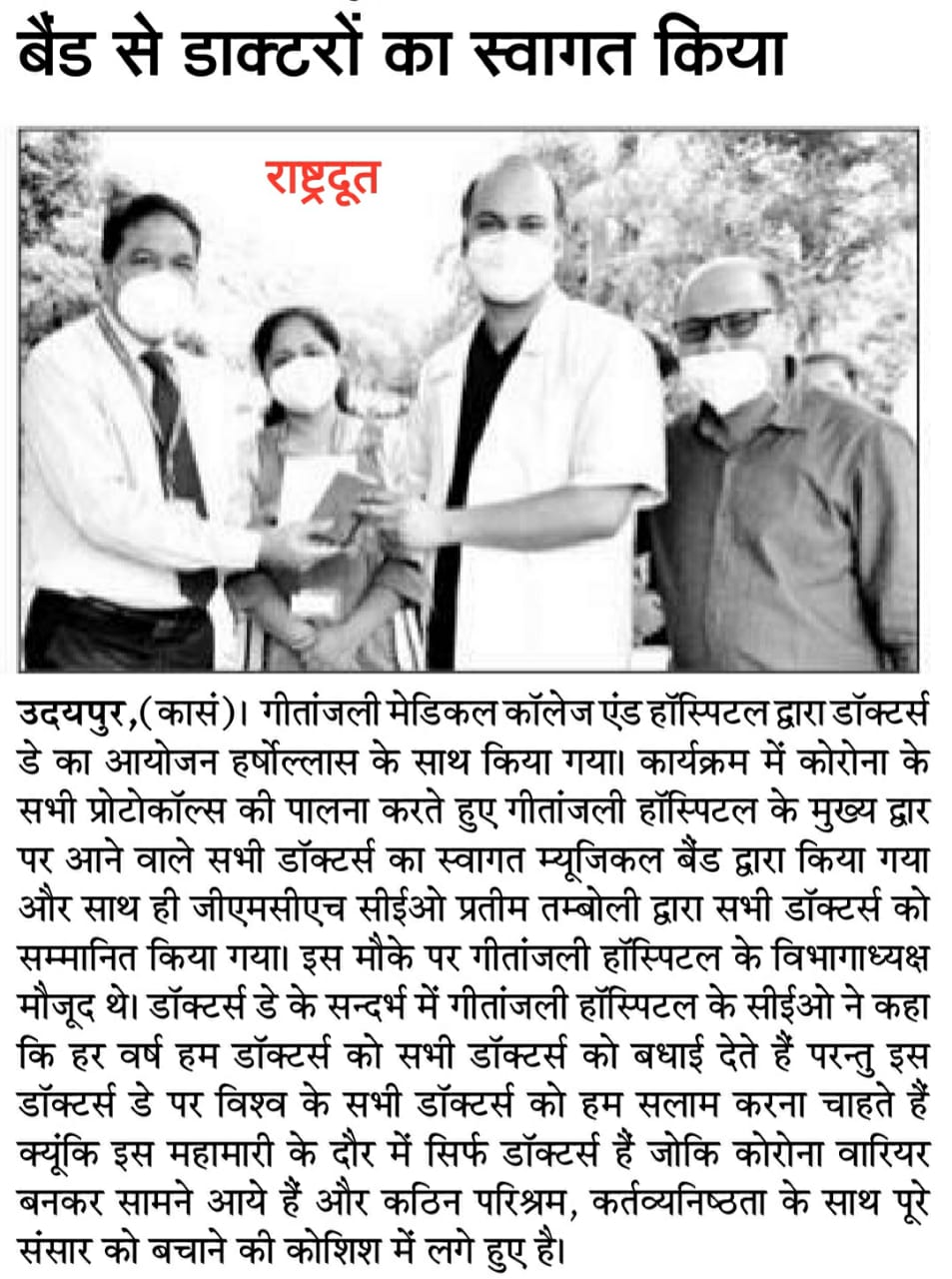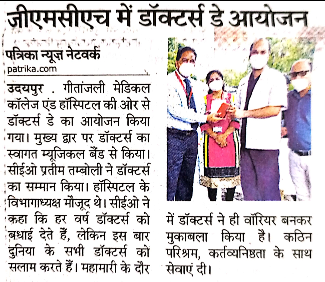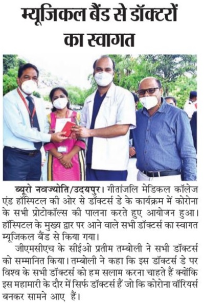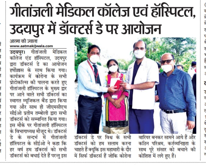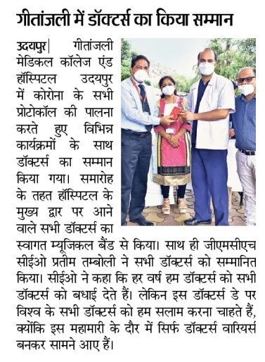 गीतांजली मेडिकल कॉलेज एंड हॉस्पिटल, उदयपुर द्वारा डॉक्टर्स डे का आयोजन हर्षोल्लास के साथ किया गया| कार्यक्रम में कोरोना के सभी प्रोटोकॉल्स की पालना करते हुए गीतांजली हॉस्पिटल के मुख्य द्वार पर आने वाले सभी डॉक्टर्स का स्वागत म्यूजिकल बैंड द्वारा किया गया और साथ ही जीएमसीएच सीईओ प्रतीम तम्बोली द्वारा सभी डॉक्टर्स को सम्मानित किया गया| इस मौके पर गीतांजली हॉस्पिटल के विभागाध्यक्ष मौजूद थे| डॉक्टर्स डे के सन्दर्भ में गीतांजली हॉस्पिटल के सीईओ ने कहा कि हर वर्ष हम डॉक्टर्स को सभी डॉक्टर्स को बधाई देते हैं परन्तु इस डॉक्टर्स डे पर विश्व के सभी डॉक्टर्स को हम सलाम करना चाहते हैं क्यूंकि इस महामारी के दौर में सिर्फ डॉक्टर्स हैं जोकि कोरोना वारियर बनकर सामने आये हैं और कठिन परिश्रम, कर्तव्यनिष्ठता के साथ पूरे संसार को बचाने की कोशिश में लगे हुए हैं|