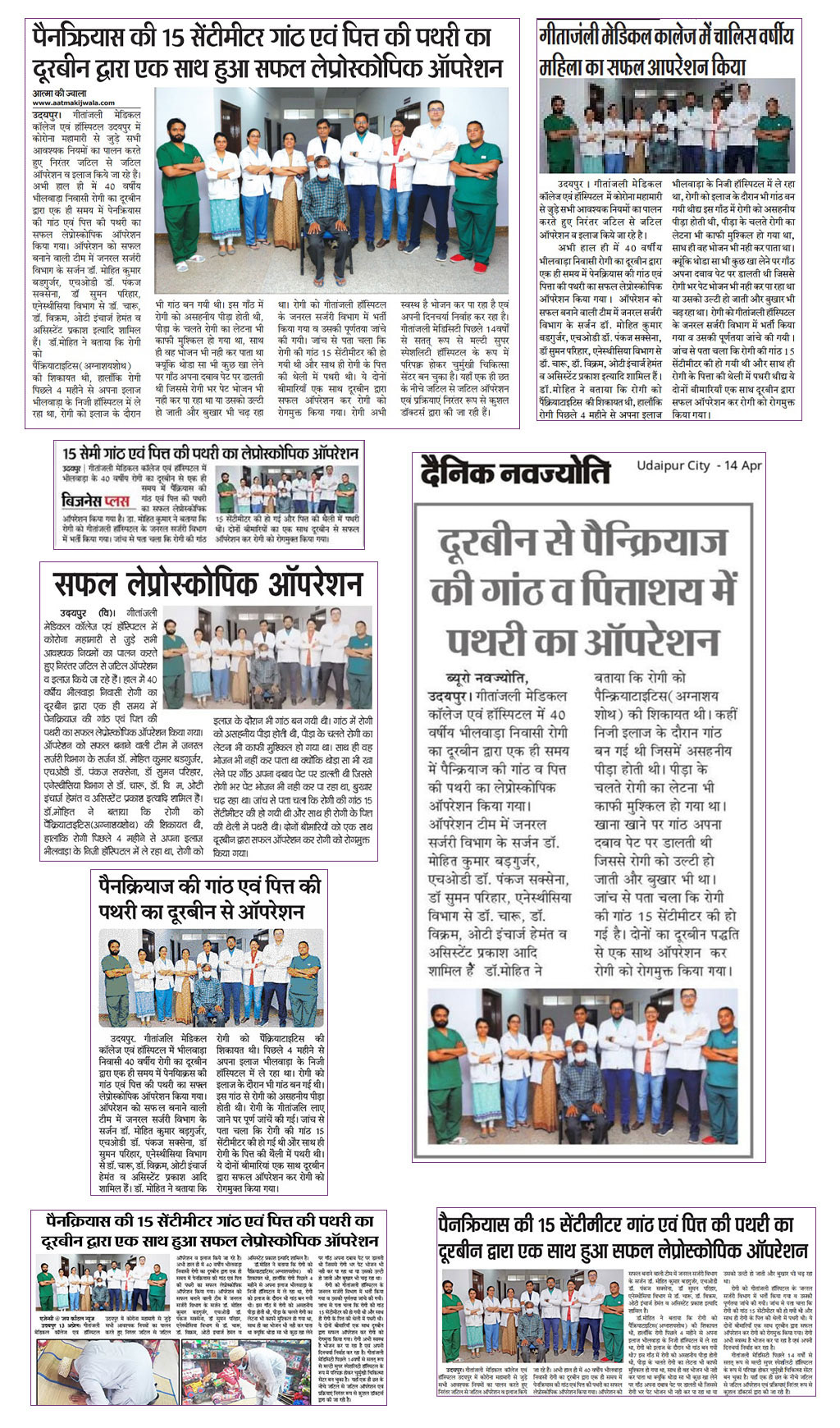 गीतांजली मेडिकल कॉलेज एवं हॉस्पिटल उदयपुर में कोरोना महामारी से जुड़े सभी आवश्यक नियमों का पालन करते हुए निरंतर जटिल से जटिल ऑपरेशन व इलाज किये जा रहे हैं| अभी हाल ही में 40 वर्षीय भीलवाड़ा निवासी रोगी का दूरबीन द्वारा एक ही समय में पेनक्रियास की गांठ एवं पित्त की पथरी का सफल लेप्रोस्कोपिक ऑपरेशन किया गया| ऑपरेशन को सफल बनाने वाली टीम में जनरल सर्जरी विभाग के सर्जन डॉ. मोहित कुमार बडगुर्जर, एचओडी डॉ. पंकज सक्सेना, डॉ सुमन परिहार, एनेस्थीसिया विभाग से डॉ. चारू, डॉ. विक्रम, ओटी इंचार्ज हेमंत व असिस्टेंट प्रकाश इत्यादि शामिल हैं|