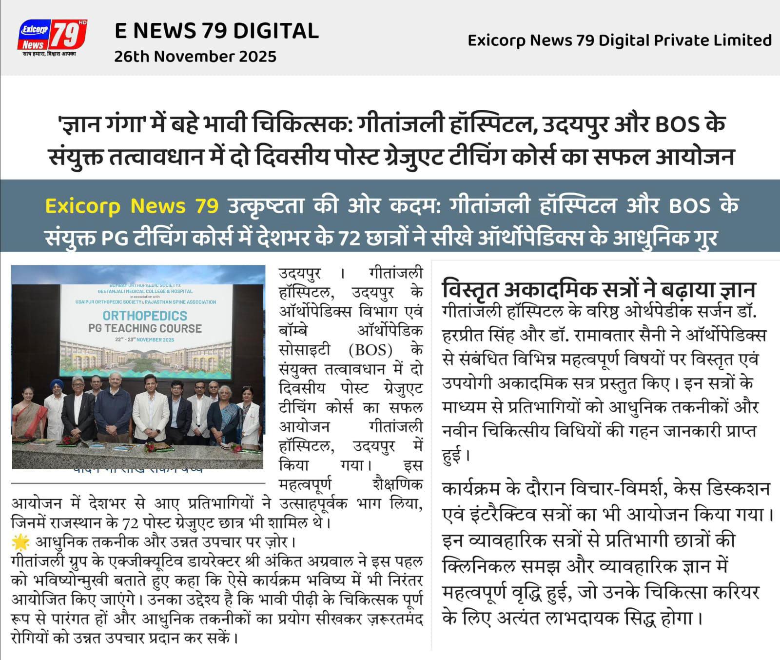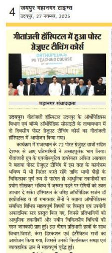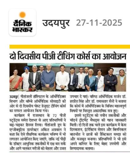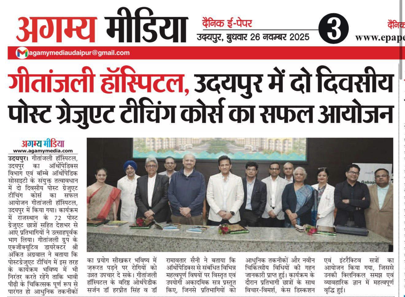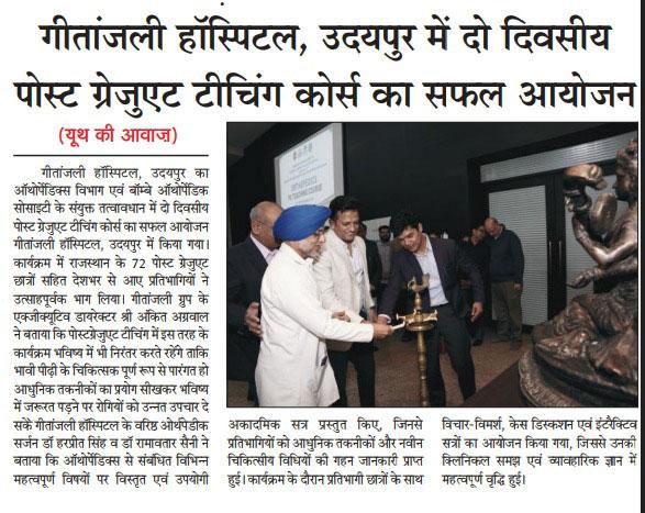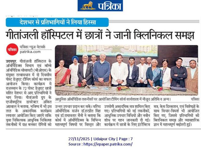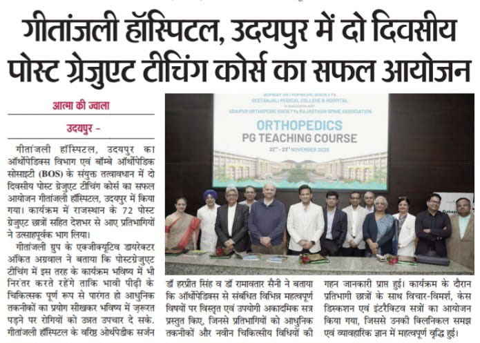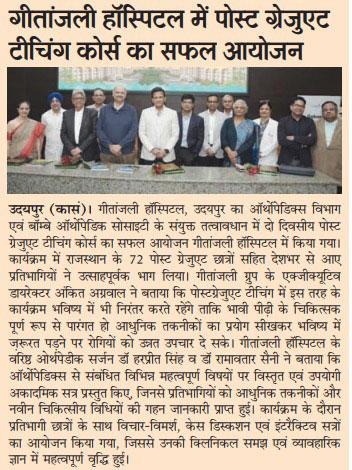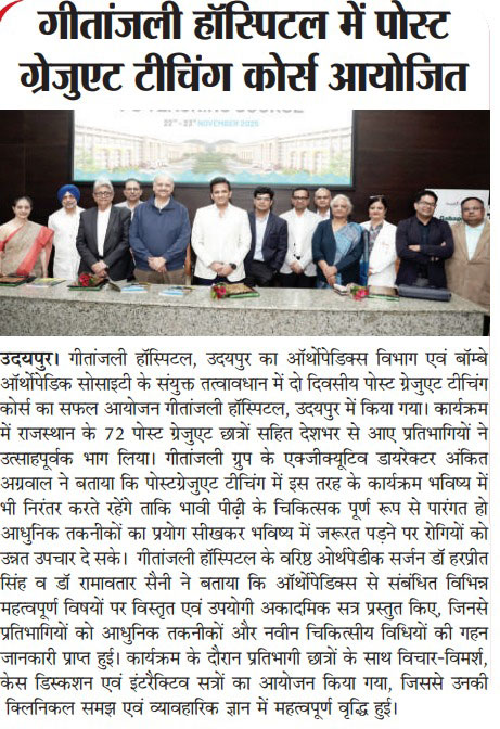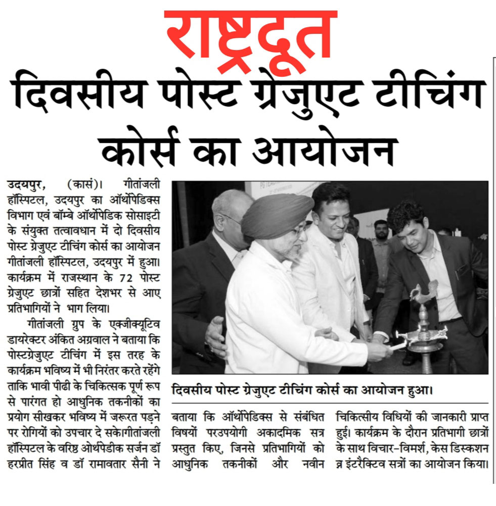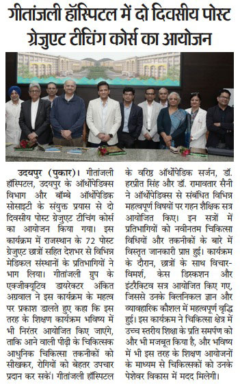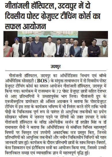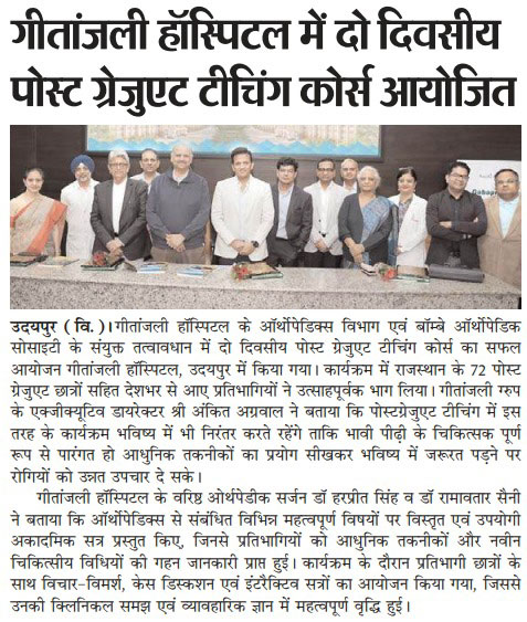 गीतांजली हॉस्पिटल, उदयपुर का ऑर्थोपेडिक्स विभाग एवं बॉम्बे ऑर्थोपेडिक सोसाइटी (BOS) के संयुक्त तत्वावधान में दो दिवसीय पोस्ट ग्रेजुएट टीचिंग कोर्स का सफल आयोजन गीतांजली हॉस्पिटल, उदयपुर में किया गया।