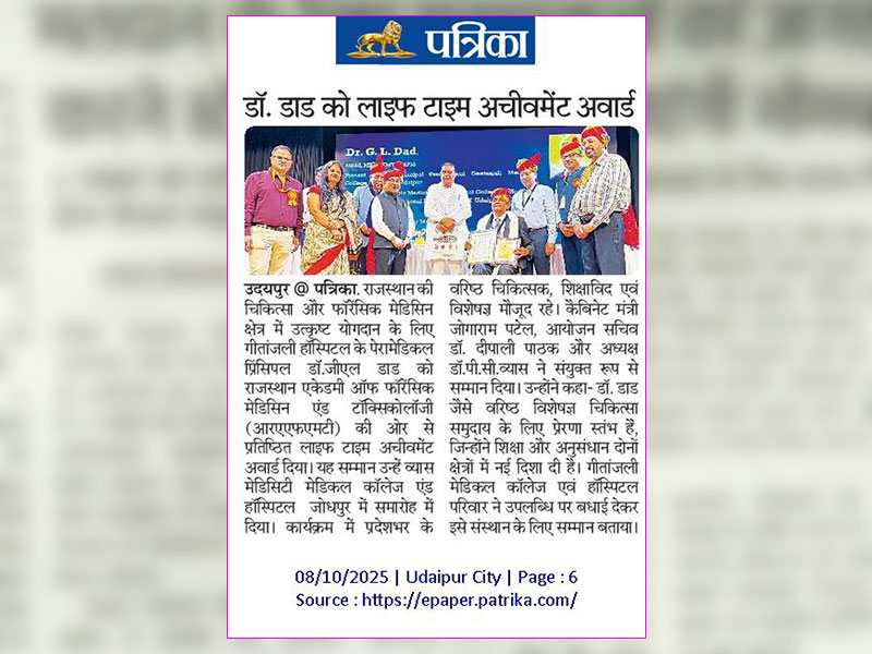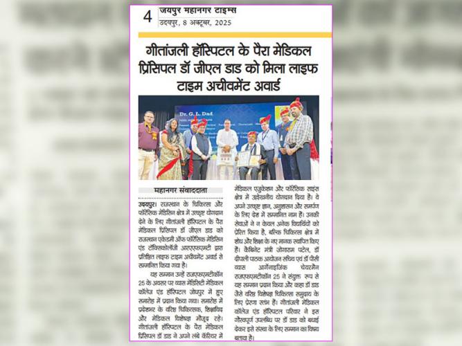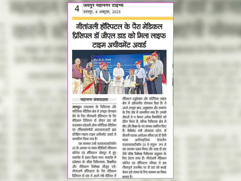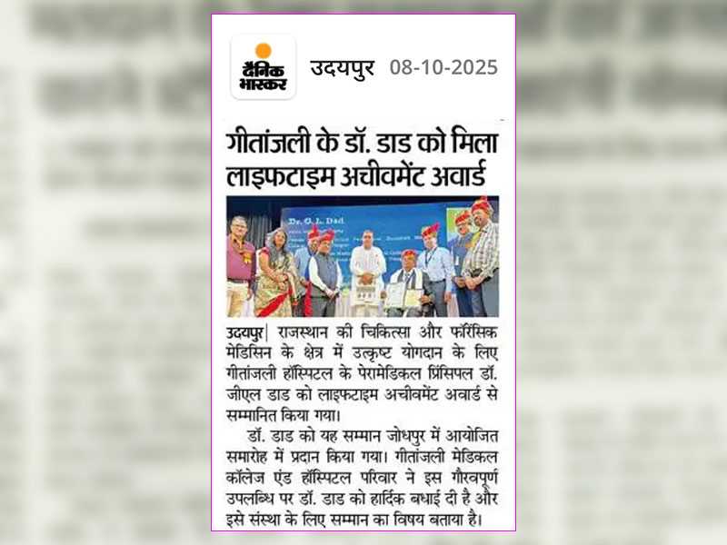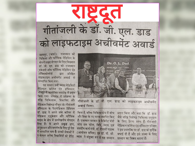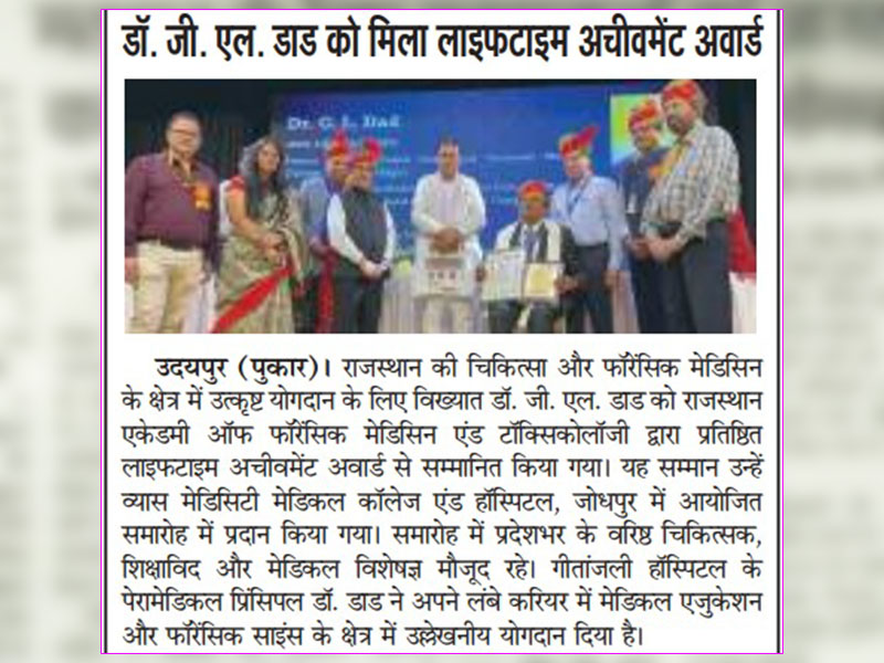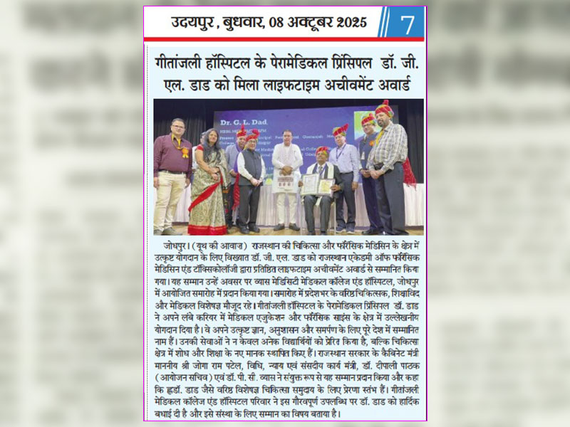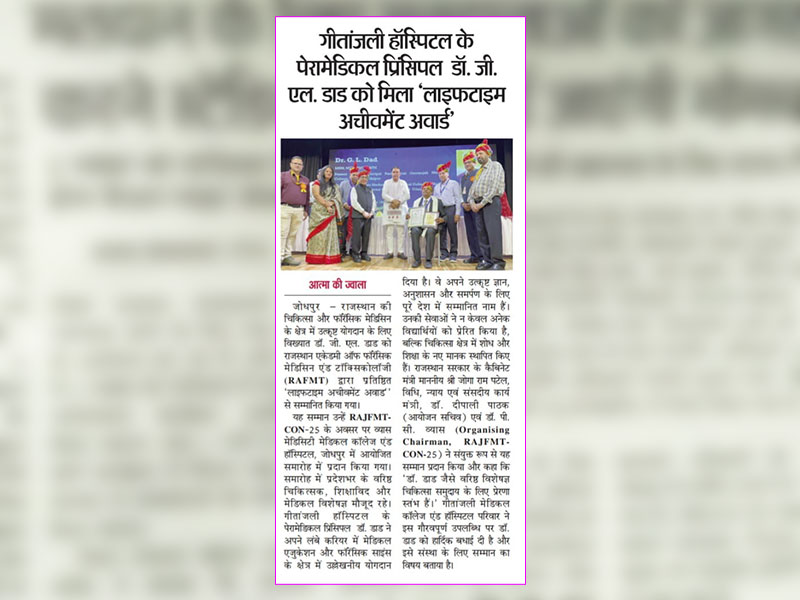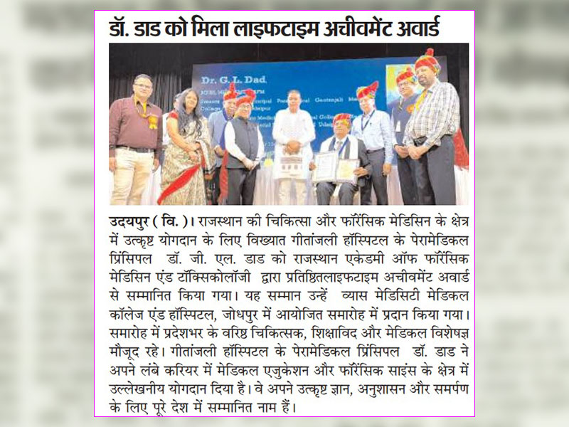 Gallery: गीतांजली हॉस्पिटल के पेरामेडिकल प्रिंसिपल डॉ. जी. एल. डाड को मिला “लाइफटाइम अचीवमेंट अवार्ड”